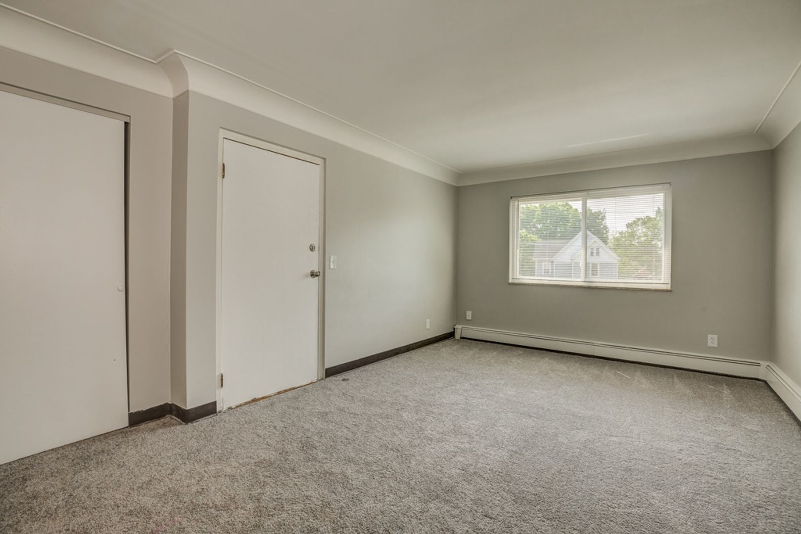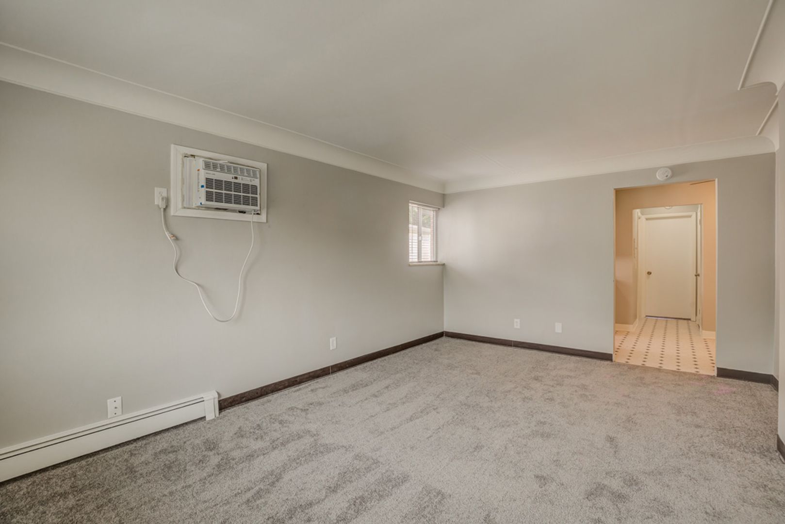This spacious one-bedroom apartment offers a cozy carpeted living room and bedroom, along with a modern kitchen featuring updated cabinets.